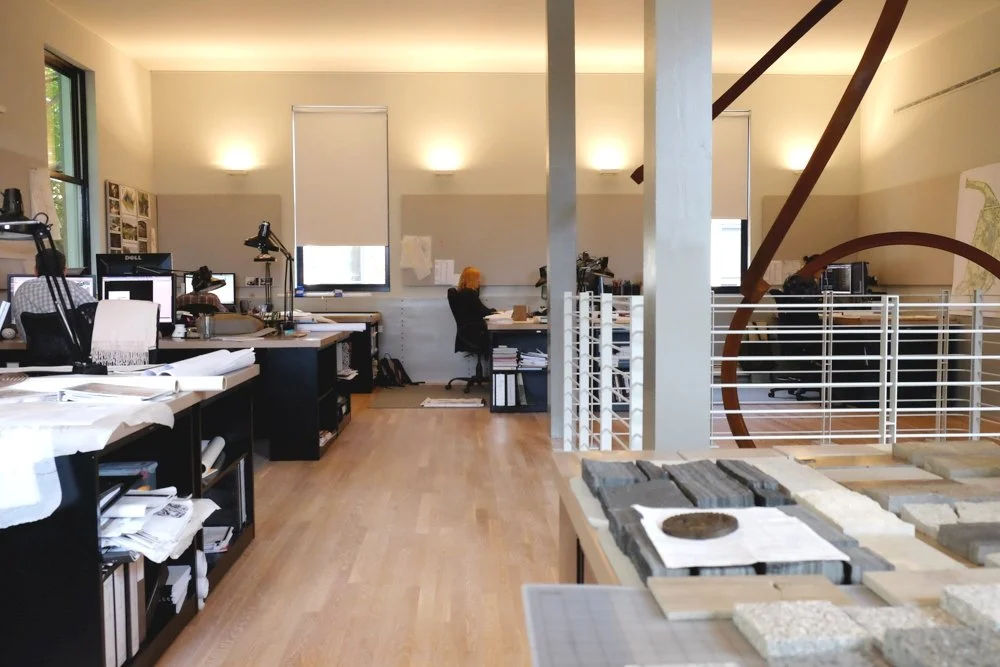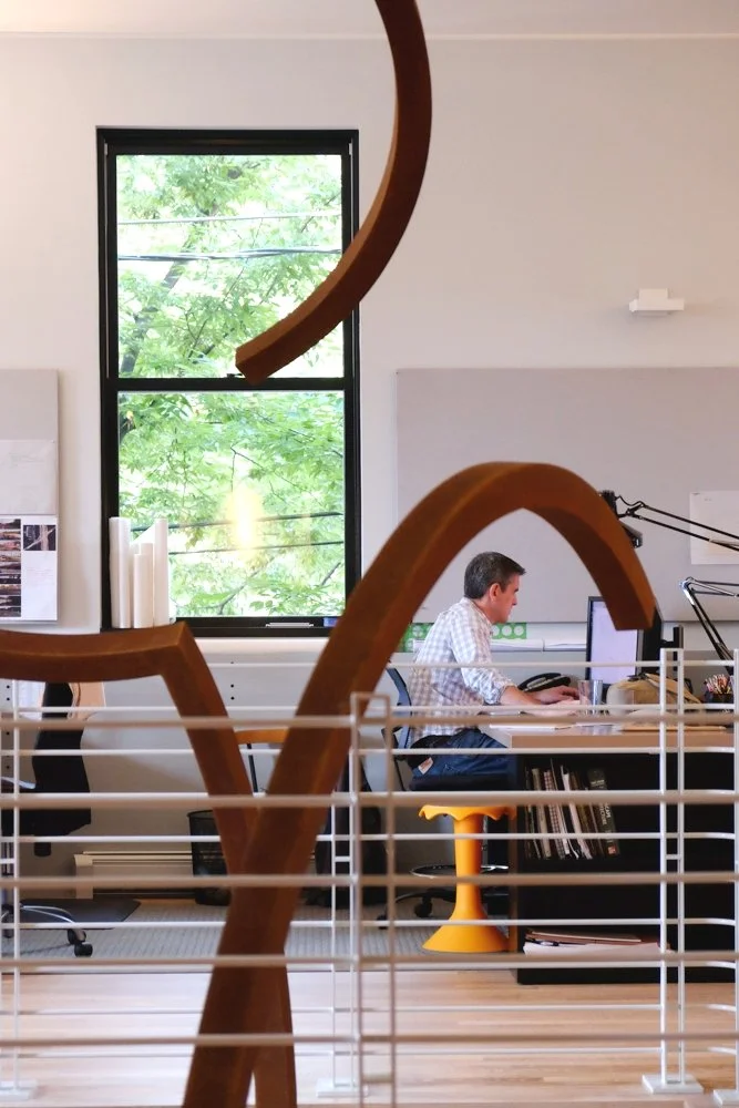 The new Charlottesville studio headquarters of NBW, an award-winning landscape architecture firm that also has offices in New York City, is a dynamic space consisting of a series of attached light industrial buildings dating from the early 1900s. The building volumes create two courtyards between them. One building functions as a two-story studio, another as a “gathering building” with the central structure functioning as the threshold in between. The primary courtyard, which accesses the street, provides the entry sequence, terminating at the gathering and meeting space. Alexander Nicholson acted as general contractor, collaborating with members of the NBW team, as well as Metal Is Good, Wispelwey Woodworking and Simin’s Custom Sewing.